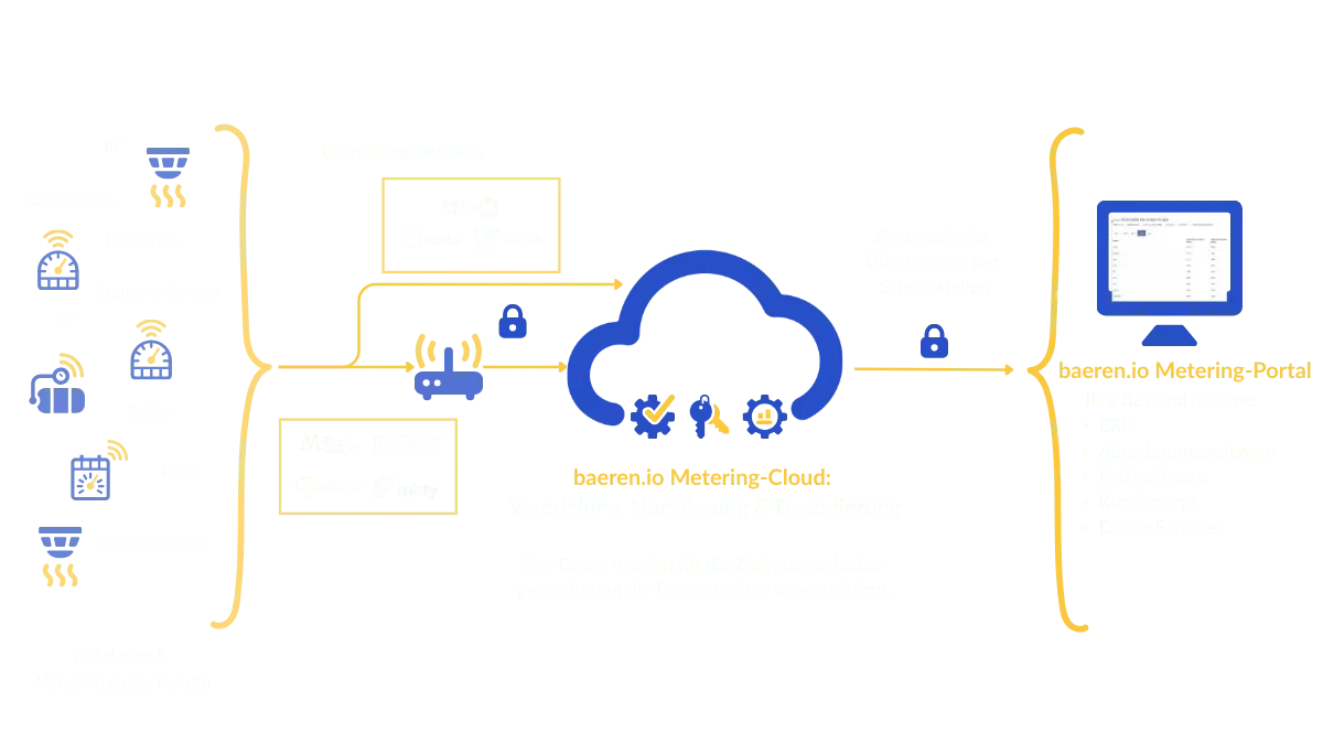 Die baeren.io Metering-Plattform ist das Herzstück Ihrer digitalen Verbrauchsdatenerfassung. Sie kombiniert eine hochperformante Metering-Cloud zur Datenverarbeitung mit einem intuitiven Metering-Portal zur Visualisierung.
