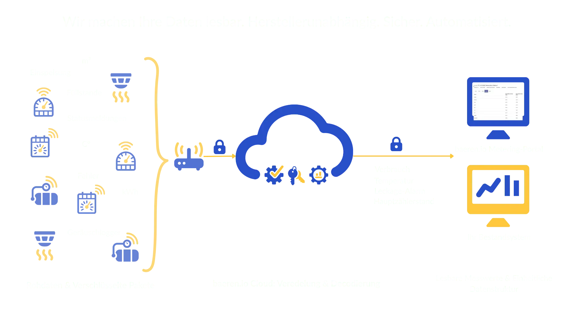 • Ja, vollumfänglich. Die baeren.io Cloud ist darauf ausgelegt, Datenpakete nach dem OMS-Standard sowie individuelle Sicherheits-Layer zu verarbeiten. Wir garantieren eine rechtssichere und hochsichere Entschlüsselung, damit Ihre Verbrauchsdaten vom Zähler bis zur Abrechnung lückenlos geschützt bleiben.